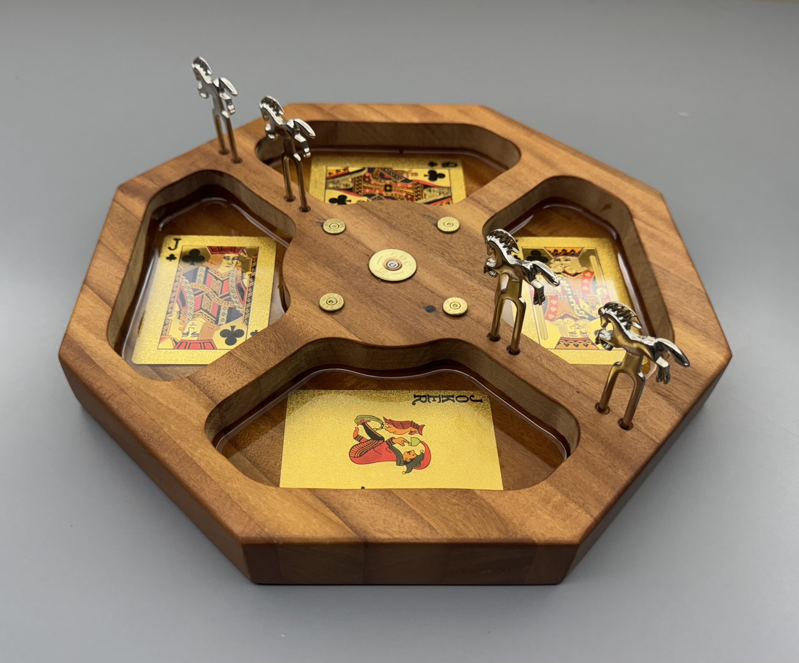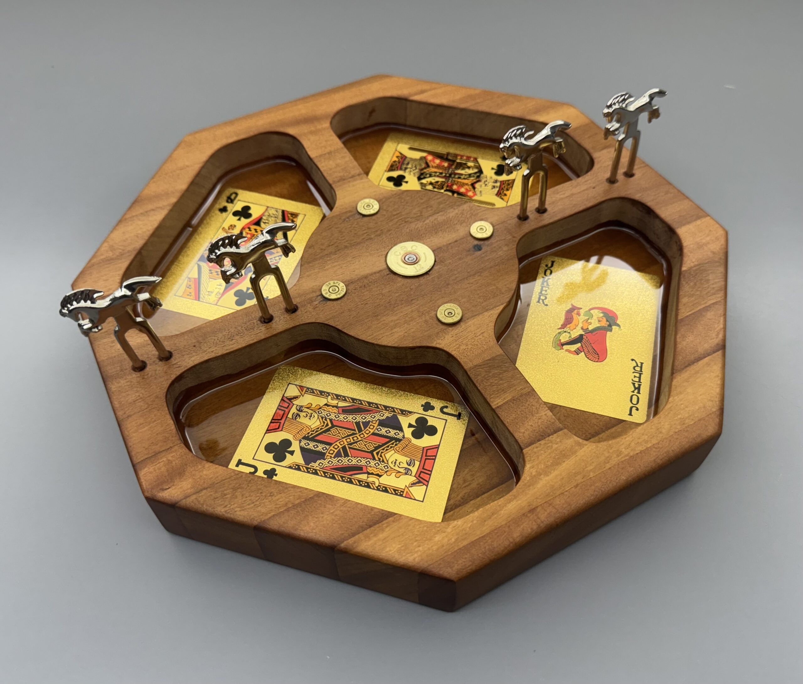 Petisqueira oitavada em madeira de garapeira marchetada com resina atóxica no fundo com 4 garfinhos para petiscos, tema de baralho.